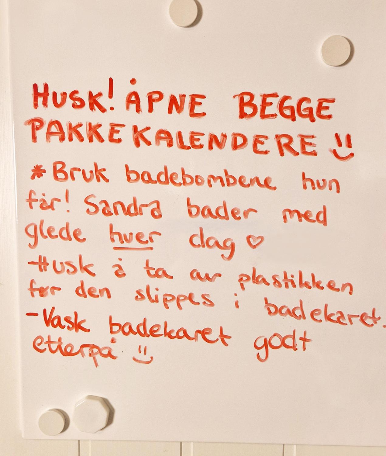 For 25 år gamle Sandra, som er født døvblind, betyr julen mer enn lys og gaver. For henne handler den om varme, trygghet og små øyeblikk av glede. Hver dag i advent får hun en ny badebombe i kalenderen sin, og i sitt eget Gemini 2000-badekar finner hun varmen og roen hun fortjener.
